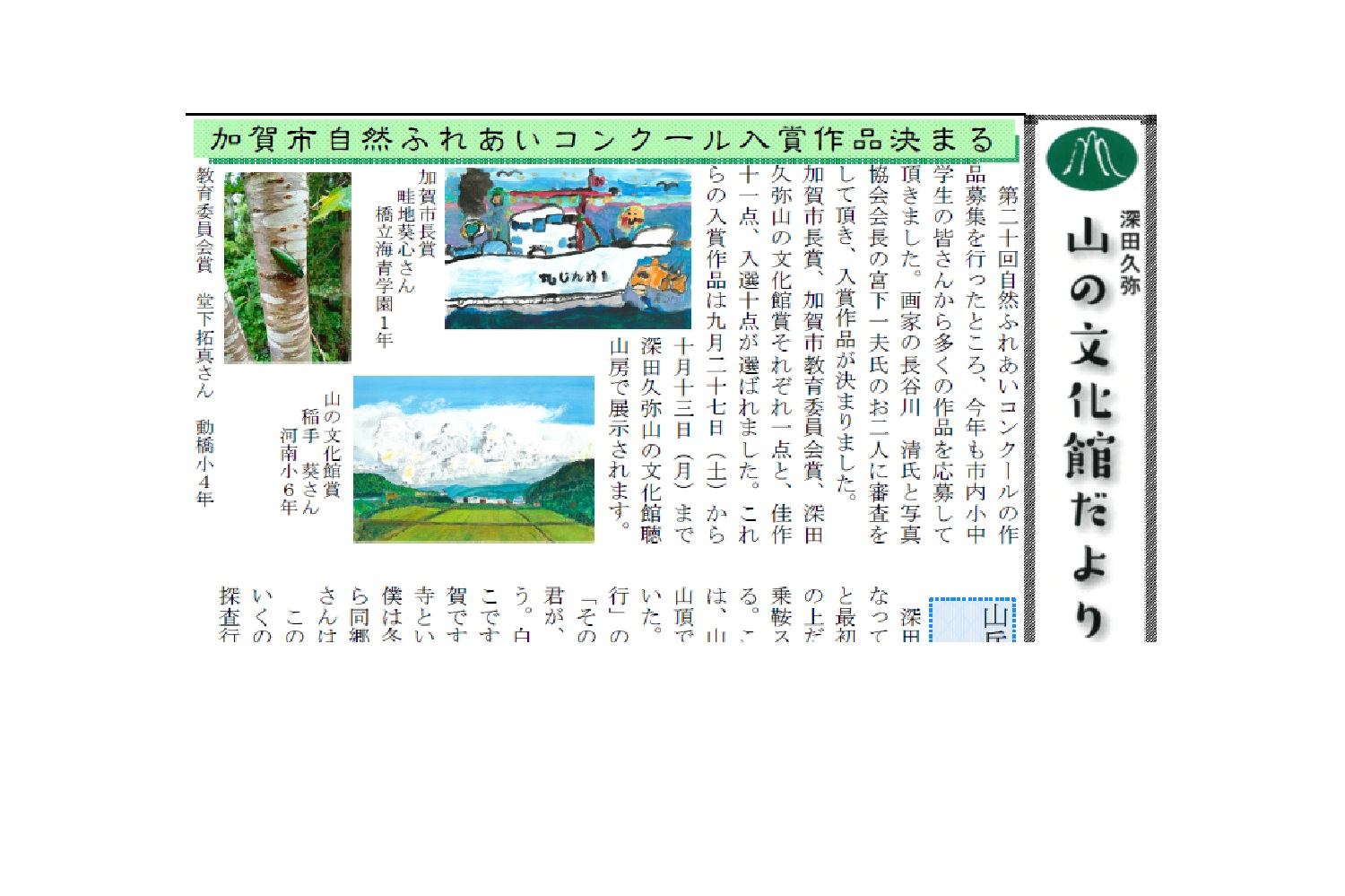 「加賀市ふるさとの自然ふれあいコンクール」を実施し、 加賀市の自然に関しての絵画、写真の作品を募集します。 対象は加賀市内小中学校の児童生徒の皆さんです。 応募... -