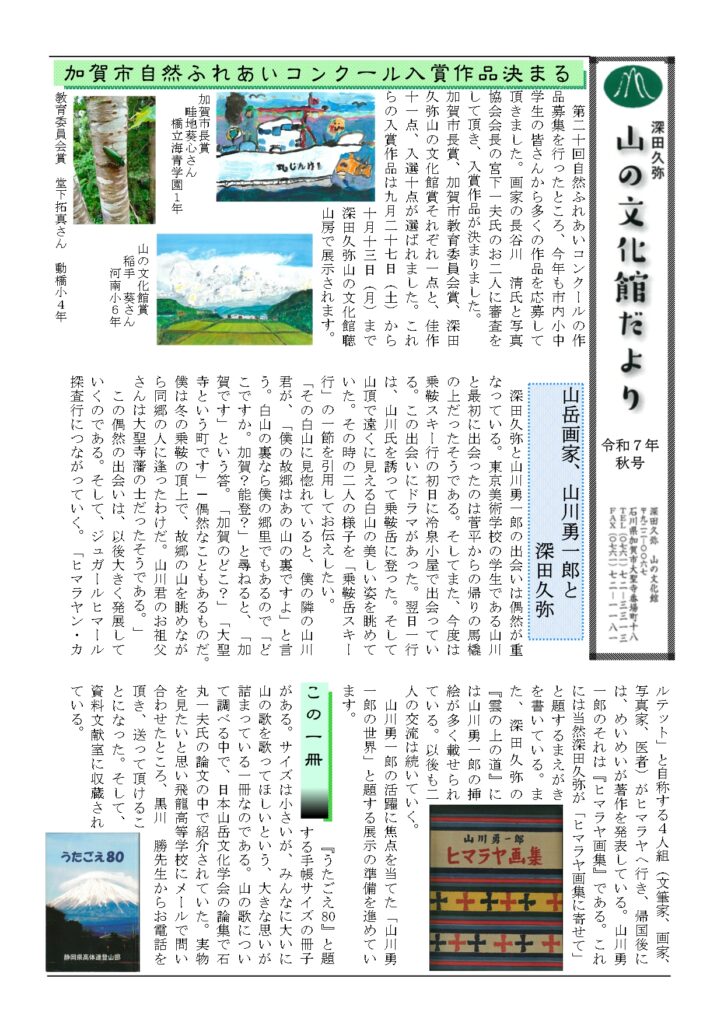 山の文化館だより秋号をお届けします。 山の文化館ニュース 山文だより よかったらシェアしてね! URLをコピーしました! 山岳画家 山川勇一郎の世界展 関連記事 山岳画家 山川勇一郎の世界展 2025年10月25日 9月聞こう会 2025年9月11日 8月聞こう会 2025年8月17日 加賀市ふるさとの自然ふれあいコンクール 2025年7月17日 山の文化館だより 令和7年夏号 2025年7月14日 6月聞こう会 2025年5月25日 5月聞こう会 2025年4月29日 山の文化館だより 令和7年春号 2025年4月24日